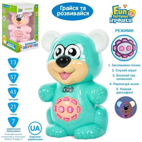 Він вміє співати пісні, розповідає вірші та казки. Керувати іграшкою дуже просто — на животику розташовані зручні кнопочки, що активують усі звукові функції.