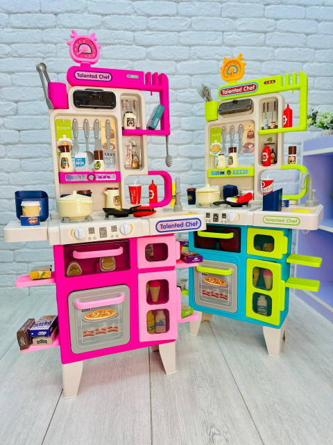 Завдяки помповій подачі води, рідина ллється з крана. Плита випускає пар, а світлові ефекти імітують вогонь.