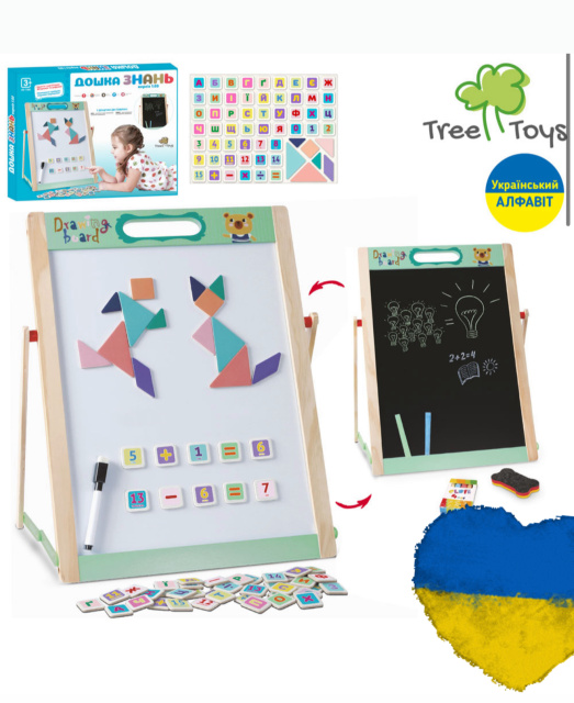 Розмір 34-23-в44см, дошка двостороння (для малювання крейдою/маркером-магнитна), магнитні фігури, український алфавіт, цифри, математичні знаки, маркер, крейда (кольорова, 4шт), губка, в кор-ці, 48-38,5-3см