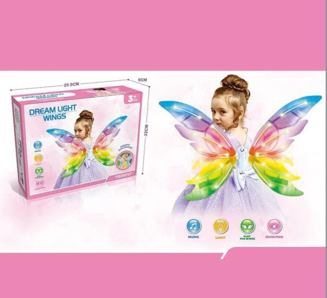 Шукаєте яскравий образ на свято? Хочете дивувати й захоплювати? Тоді ці яскраві реалістичні крила вигідно довершать ваш образ чарівної феї! Крила виконані з напівпрозорого матеріалу, який блищить й переливається на світлі, посилюючи ефект магічних чарів та вигідно підкреслюючи будь-який наряд. Також крила мають дві вбудовані мінігірлянди, які створюють ефект “магічних вогників” на крилах. Іграшка має два режими роботи: беззвучний, у якому крила тихо поволі розкриваються й закриваються, та із музикою, коли іграшка програє спокійну інструментальну мелодію паралельно своїй роботі.