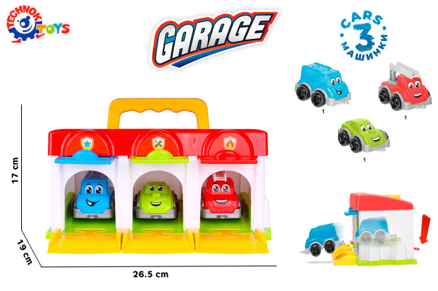 У гаражі 3 бокси з тематичними наліпками над воротами та відповідним кольором дверей: поліційна дільниця, СТО, пожежна станція. У кожному боксі спеціалізований автомобіль: великий блакитний мікроавтобус, швидкісний салатовий спорткар та потужна червона пожежна машина з рухомою драбиною. Переносити гараж на інше місце зручно за ручку на даху.