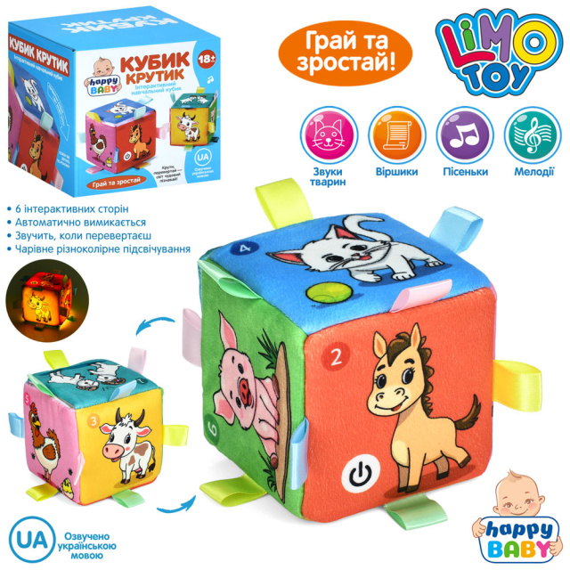 Кубик крутик — яскрава навчальна іграшка для малюків, яка поєднує гру та розвиток. Кубик-крутик розміром 10 см виготовлений із поєднання м’якого плюшу та міцного пластику, завдяки чому приємний на дотик і безпечний для дітей. На гранях розташовані зображення тварин та інтерактивні кнопки. Іграшка озвучує вірші та пісні українською мовою, відтворює звуки тварин і мелодії, супроводжуючи гру світловими ефектами. Таке поєднання сприяє розвитку слухового та зорового сприйняття, пам’яті, мовлення й уяви. Кубик працює від батарейок і постачається в коробці розміром 10,5×10,5×10,5 см.