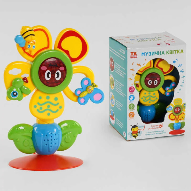Музична іграшка виконана у формі квіточки, на пелюстках якої розташувалися пташка, метелик та бджілка.